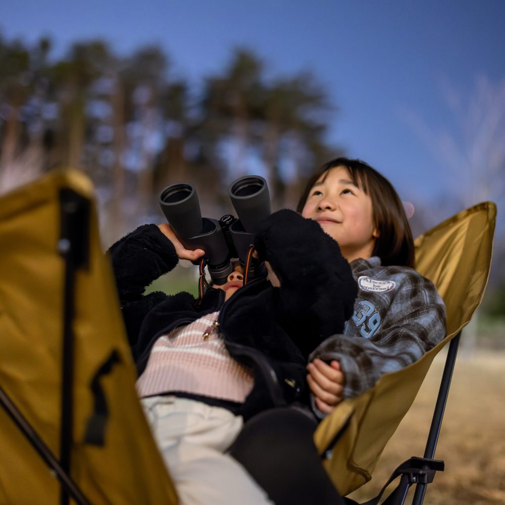 映像の星座と本物の星空を同時にお楽しみいただけます。また、リクライニングチェアやレジャーシート、双眼鏡や星座早見盤もご用意しお子さまにも