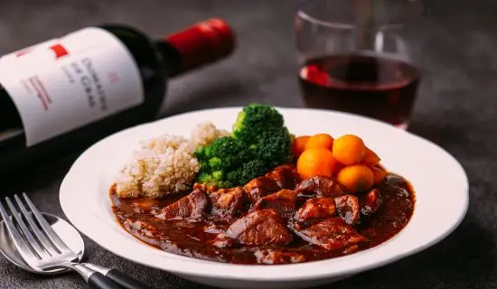 肉を美味しく味わうための知恵から生まれた、フランスの伝統料理。じっくりと時間をかけ、最大限に引き出された牛肉の旨みを、ヘルシーなキヌアとともにお楽しみいただけます。添えられた人参は各ホテルの地元の味噌で味付けしています。